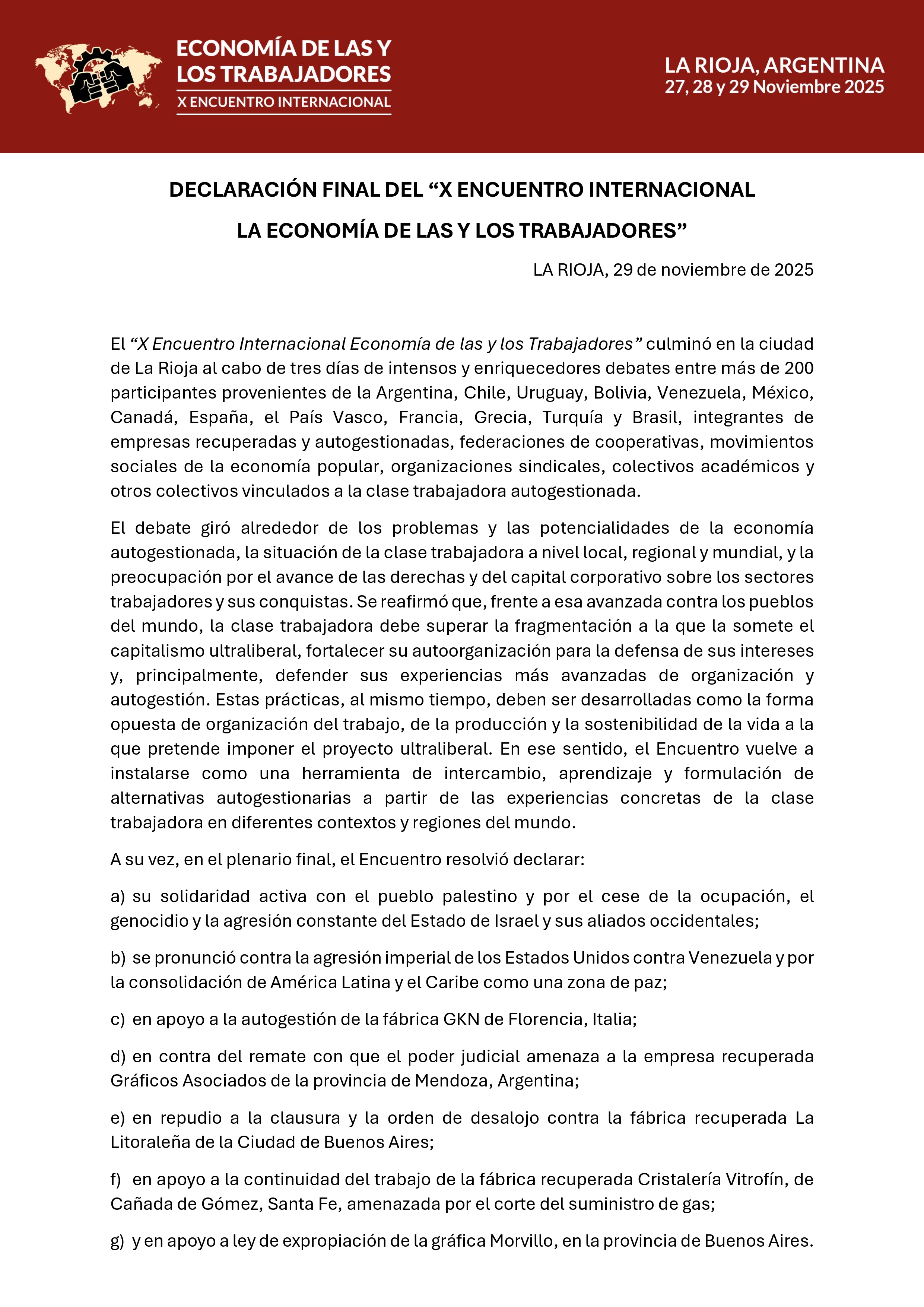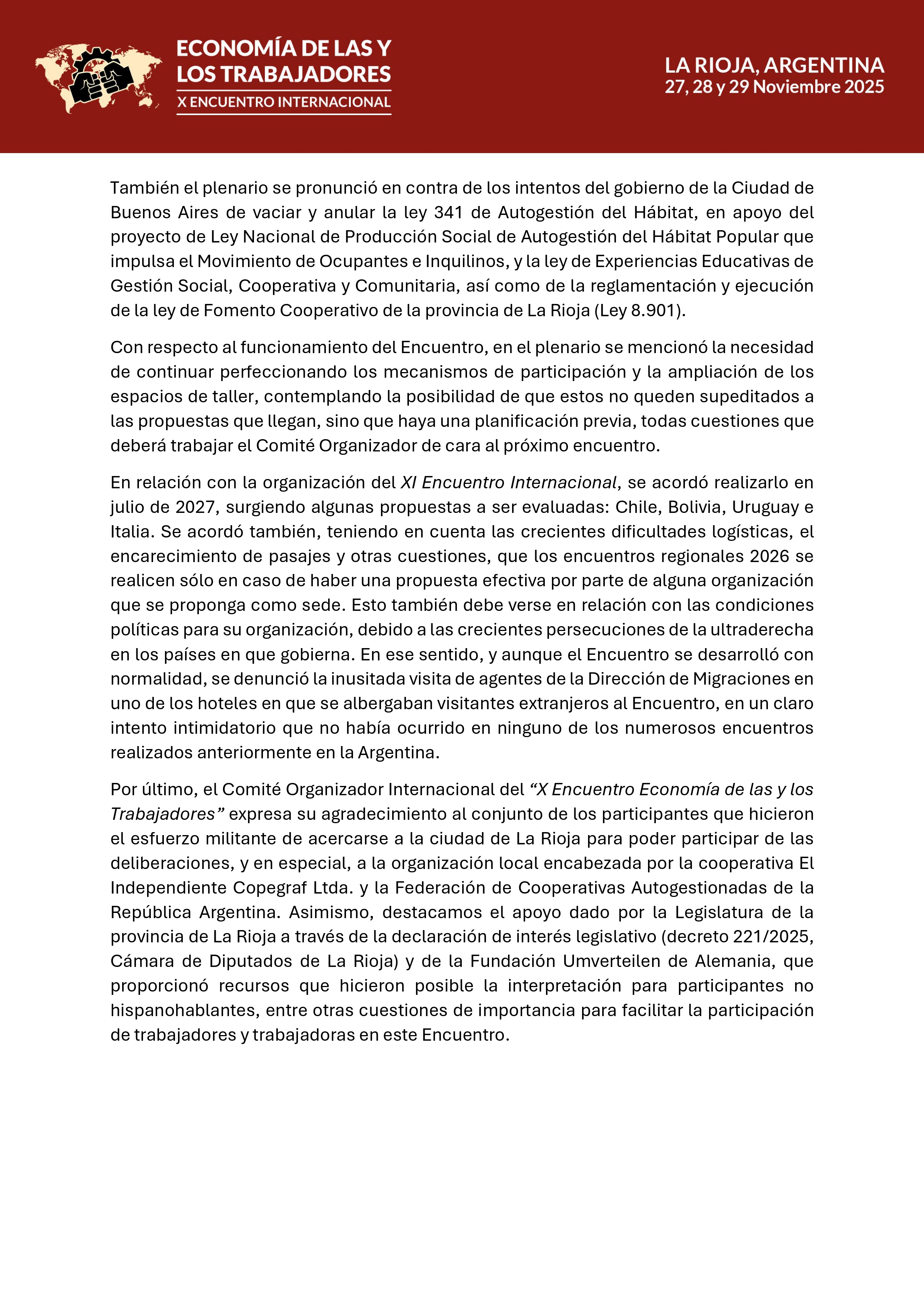 El X Encuentro Internacional “La Economía de los/as Trabajadores/as” se llevará a cabo en la ciudad de La Rioja, Argentina, del 27 al 29 de noviembre de 2025.